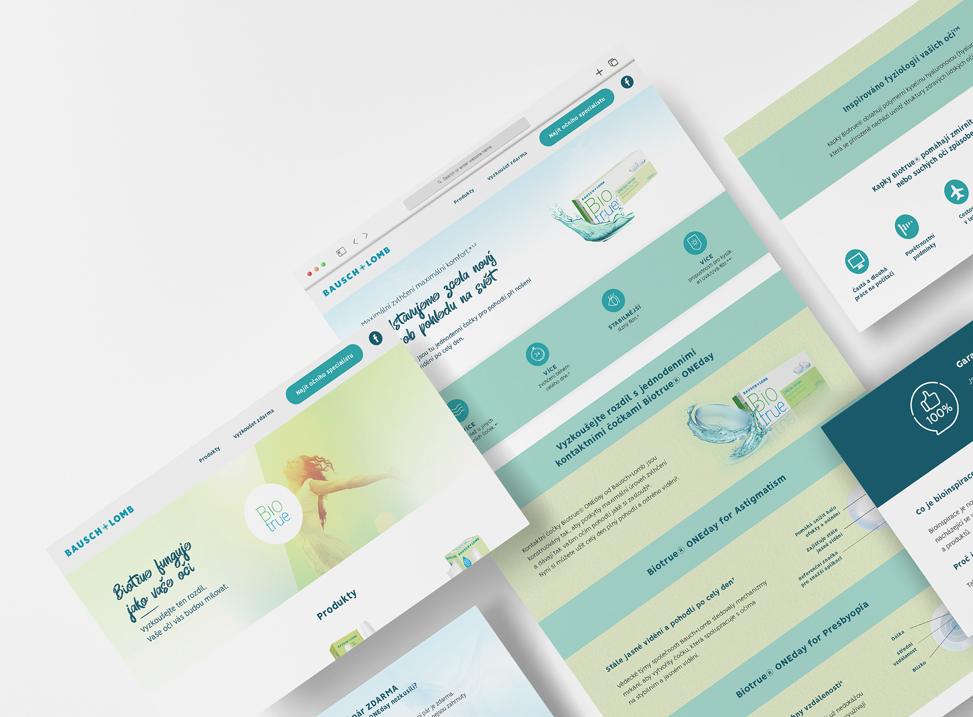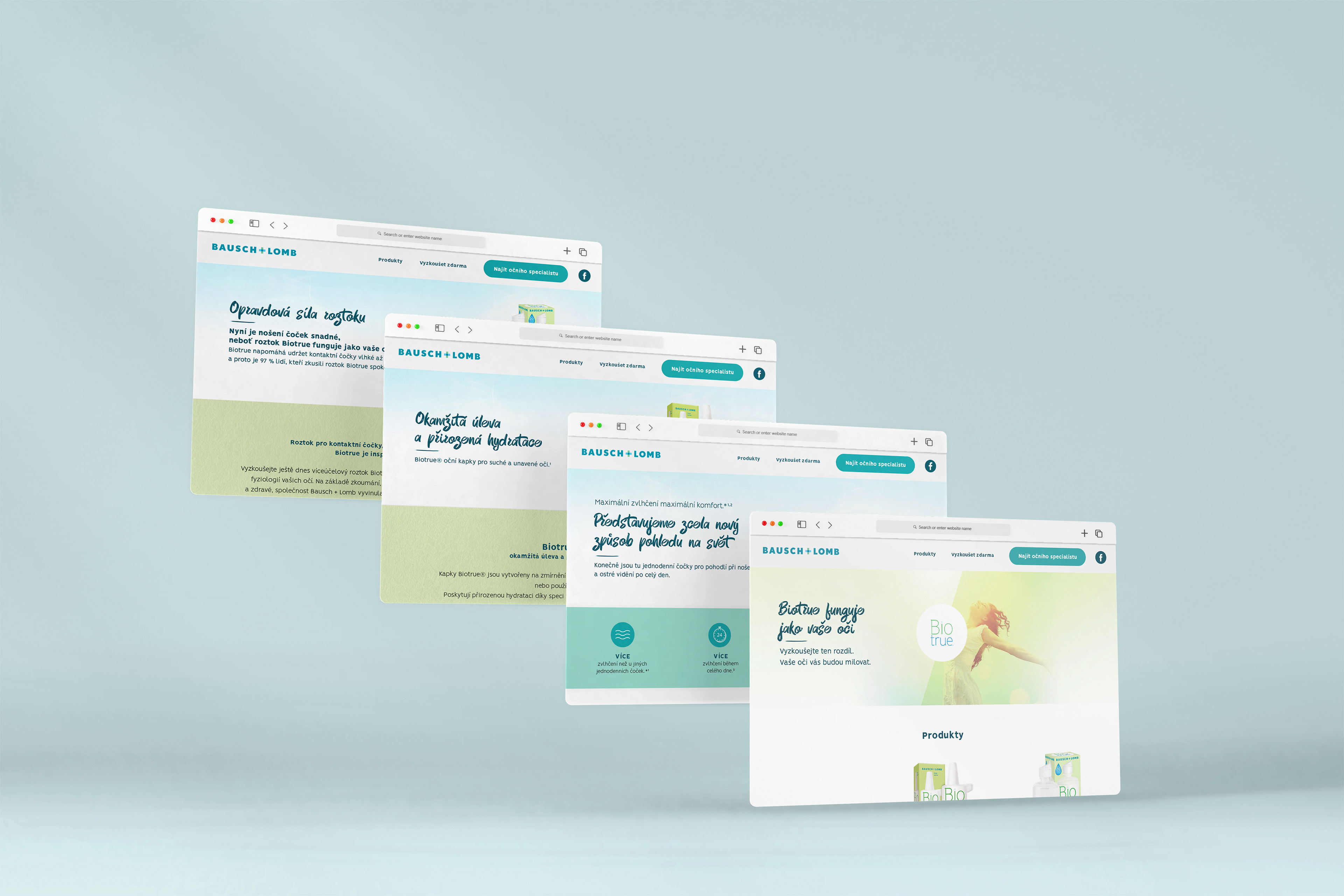 Podílela jsem se na návrhu webových stránek pro produkt Bio true od společnosti Bausch + Lomb. Měla jsem na starosti vizuální koncept a grafické zpracování webu s důrazem na čistotu, důvěryhodnost a jasnou komunikaci benefitů očních kapek. Cílem bylo vytvořit moderní a přehledné prostředí, které podpoří vnímání značky a zároveň uživatelům srozumitelně představí vlastnosti a výhody produktu Bio true.